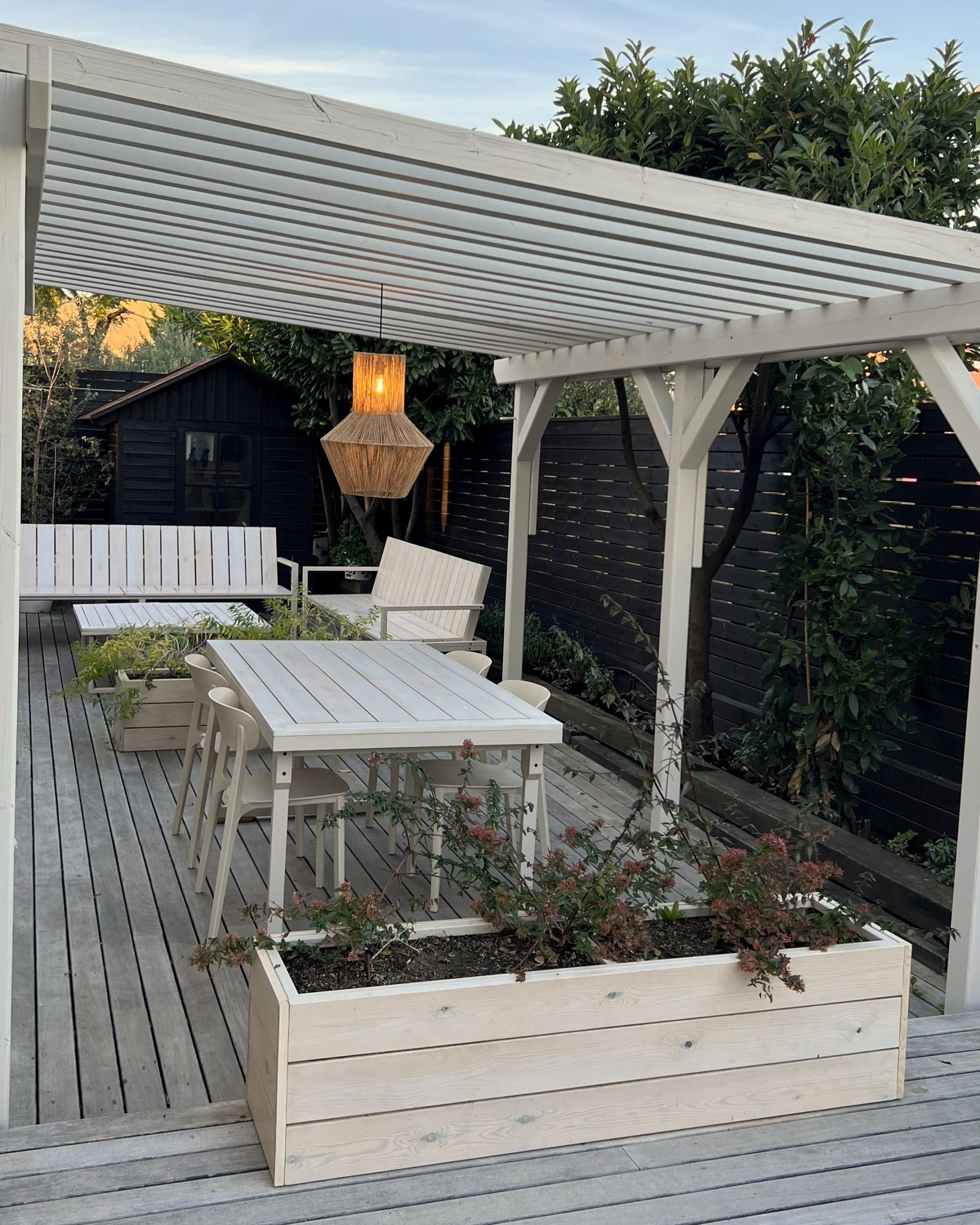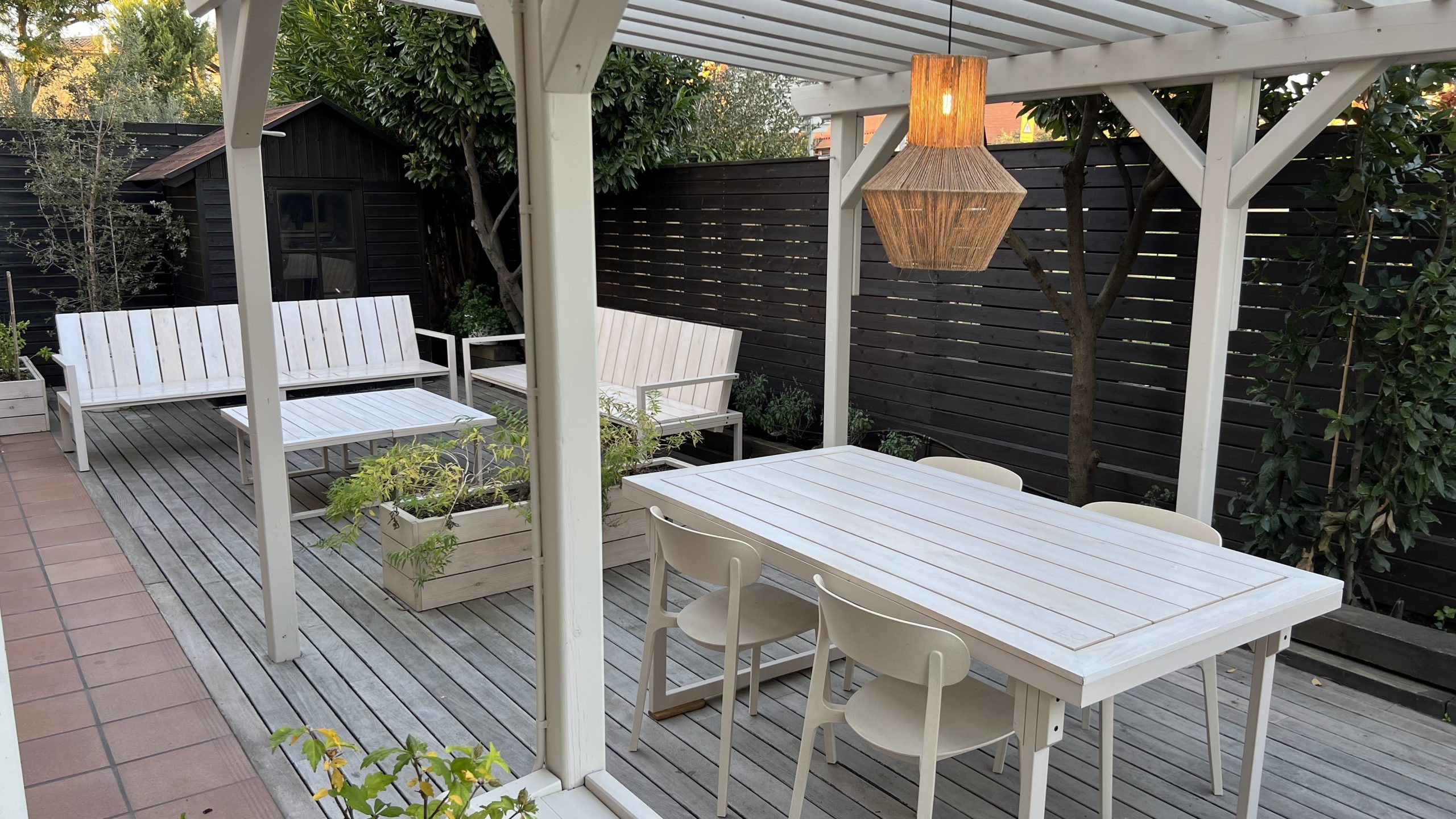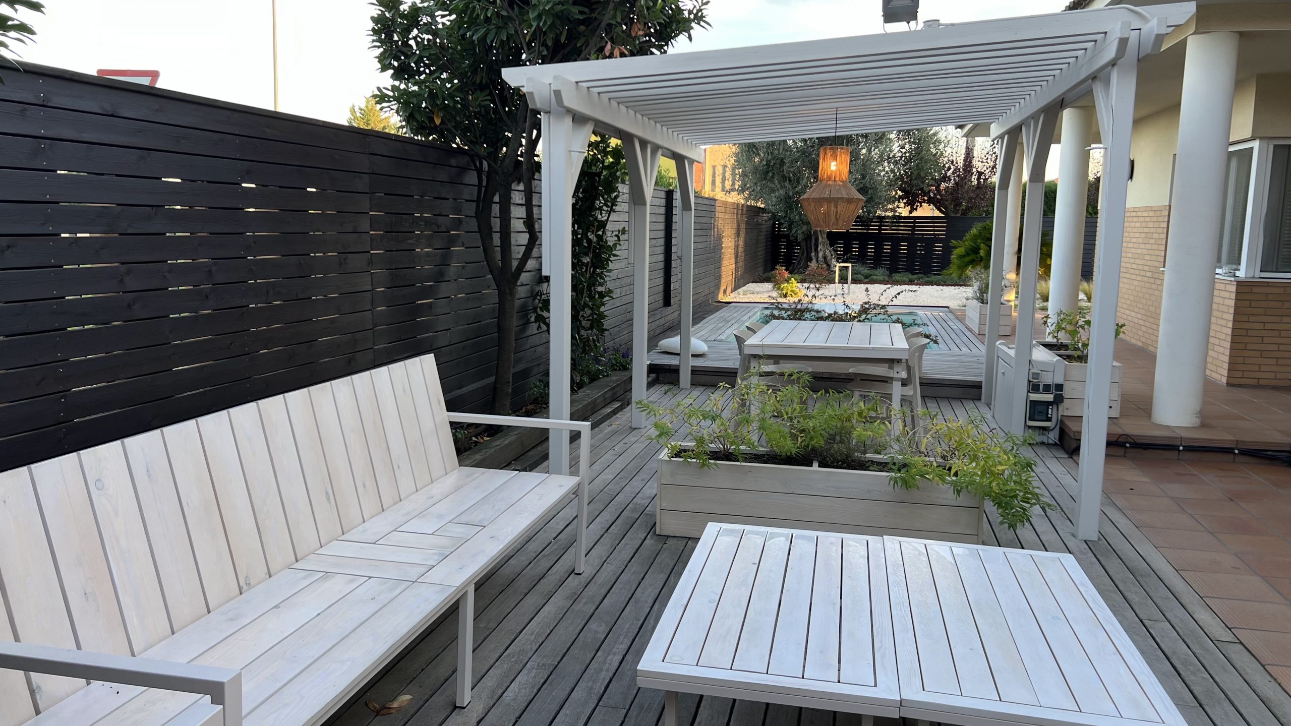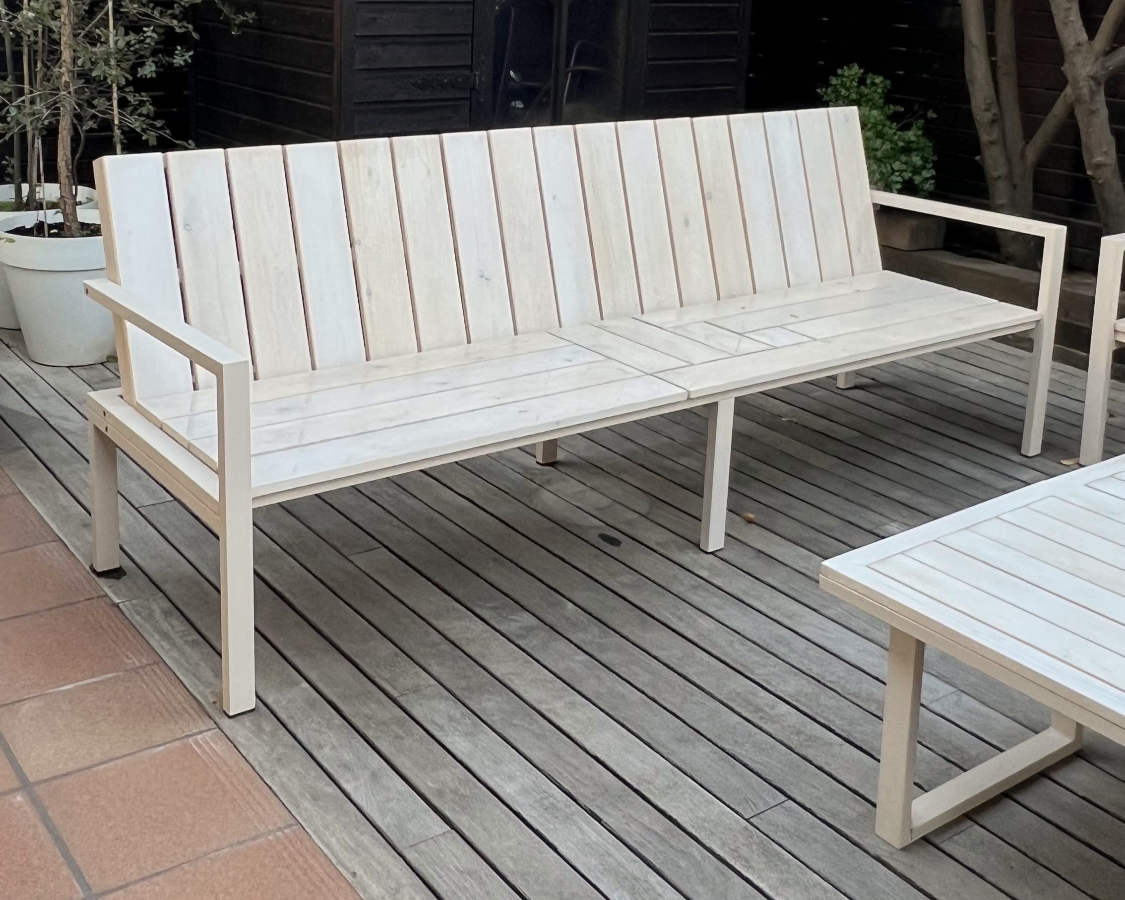 Conjunto de mobiliario exterior hecho con estructura de acero esmaltado y madera de pino natural tratada con barniz al agua, formado por: